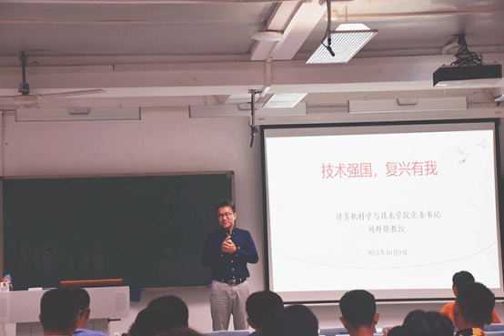2023年10月9日下午,公司党委书记刘群锋在6F-501课室为2023级计算机类4-6班全体员工上了“思政第一课”。