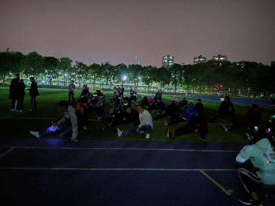 荧光跑开始前,参与人员用领取的荧光棒、荧光头饰装饰着自己,并在工作人员的带领下做好充分的热身运动。紧接着,装备着绚丽多彩荧光棒的参加人员出发奔向前方,按照从假草开始,途经全家便利店、大礼堂、行政楼、图书馆,最后回到假草的路线向前奔跑。一路上,荧光点缀着夜晚的莞工,参与人员互相照顾、共同进步,显现出积极向上的精神面貌。