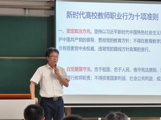 随后,刘群锋详细解读了新时代高校教师职业行为十项准则。这十项准则涵盖了政治方向、爱国守法、传播优秀文化、教书育人、关心爱护员工、言行雅正、遵守学术规范、公平诚信、廉洁自律和积极奉献社会等方面,为全体教职工指明了职业行为的标准和方向。