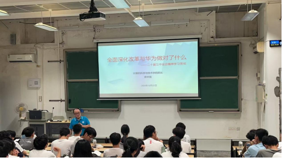 10月22日上午,bevictor伟德官网经理袁华强在6E-104教室为2024级计算机类7班、2024级网络空间安全1班和2024级网络空间安全2班的120名员工带来了新学期的“思政第一课”。本次课程紧密围绕党的二十届三中全会精神,以“全面深化改革与华为做对了什么”为主题,为新生们带来了一场深刻而生动的思想教育。