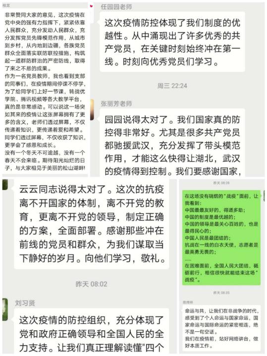 马云云同志:疫情的基本阻断,抗疫的初步胜利离不开我国不断提高的医疗卫生水平,医护人员的坚守担当和科研人员夜以继日的攻坚克难,更是国家的体制,党的领导让各地各部门迅速行动,构筑起了严密的防线。世界上哪有什么岁月静好,只是有人在负重前行。我们要向抗疫英雄学习,向优秀党员学习,在三尺讲台教书育人,在专业领域严谨科研。