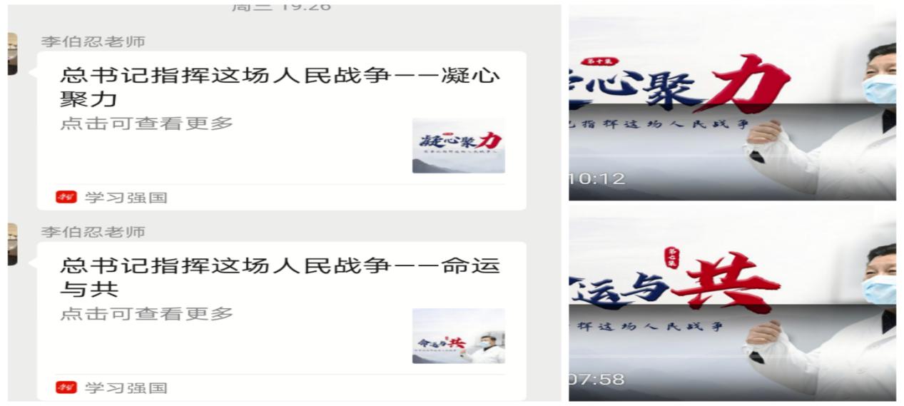 首先,李伯忍书记引领大家观看了在“学习强国”平台发布的《总书记指挥这场人民战争系列》之《命运与共》和《凝心聚力》。视频《命运与共》中,总书记强调,中国政府始终本着公开、透明、负责任的态度及时向国内外发布疫情信息,积极回应各方关切,加强与国际社会合作。命运与共,全球战“疫”,中国在全面有力防控疫情的同时,积极主动同世卫组织和国际社会开展合作和信息交流,迅速分享部分毒株全基因组序列,研制成功快速检测试剂盒,努力防止疫情在世界蔓延,充分体现了大国的担当精神。视频《凝心聚力》中,总书记多次强调,打赢这场疫情防控阻击战,重点在“防”,要紧紧依靠人民群众,充分发动人民群众,使所有社区成为疫情防控的坚强堡垒。在总书记的指挥下,从城市到乡村,从内地到边疆,各族群众全面落实联防联控措施,构筑起一道群防群治的严密防线。总书记一句“非常时期就不握手了”,却把全国人民的心紧紧地凝聚在了一起。