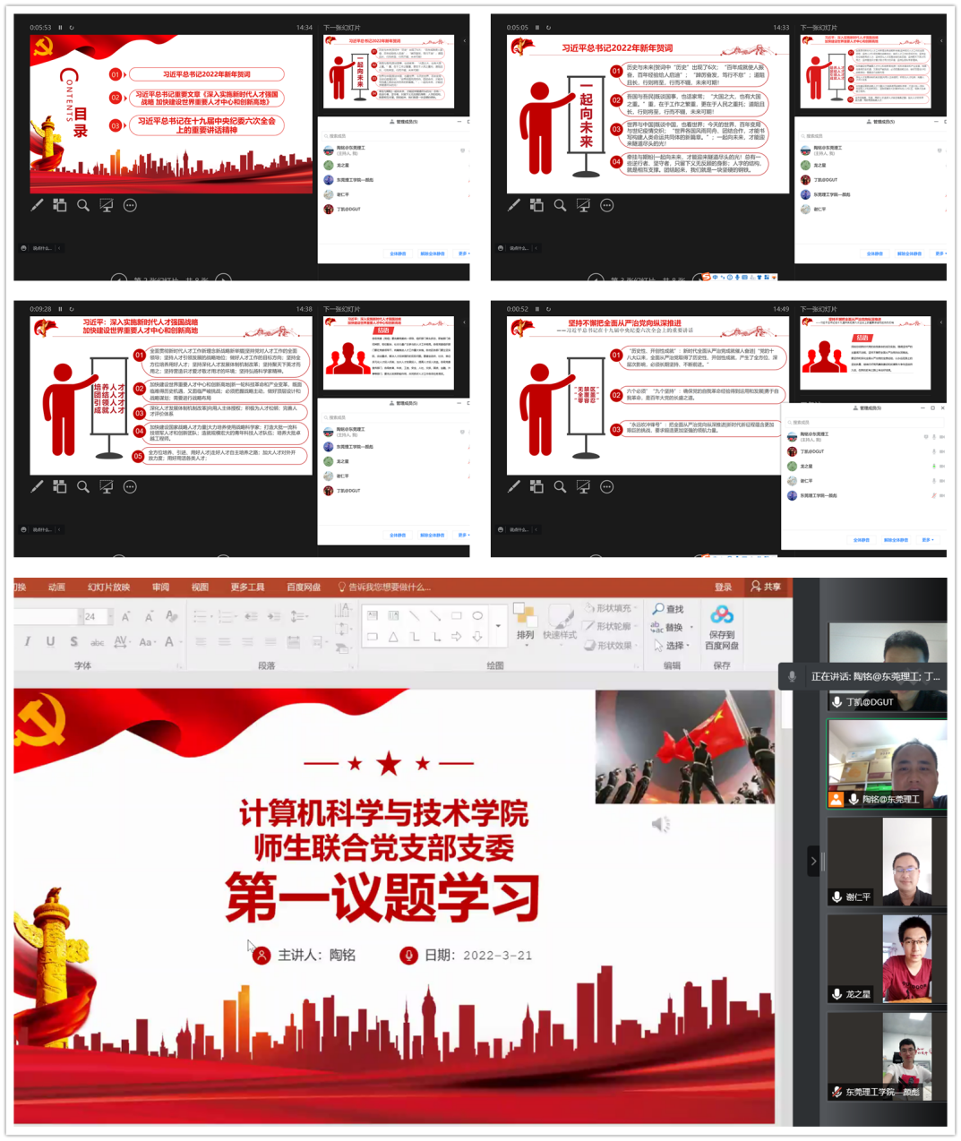 第一、陶铭同志组织与会党员同志集体学习了习近平总书记2022年新年贺词、习近平总书记重要文章《深入实施新时代人才强国战略 加快建设世界重要人才中心和创新高地》、习近平总书记在十九届中央纪委六次全会上的重要讲话精神。与会党员就各自的学习体会进行了发言: