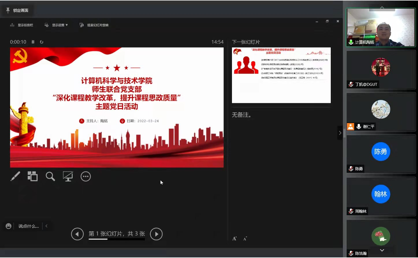 为全面贯彻落实习近平总书记关于教育的重要论述和全国教育大会精神,高质量推进课程思政,2022年3月24日下午15:30,公司师生联合党支部在腾讯会议平台召开了“深化课程教学改革,提升课程思政质量”主题党日活动。本次活动由支部书记陶铭同志主持。