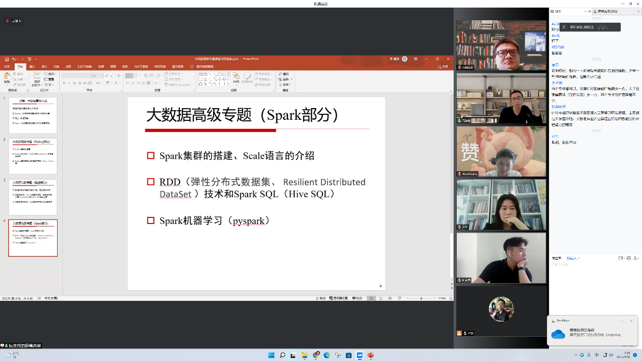 接下来,各位老师们依次向大家介绍了数据科学与大数据技术专业的核心课程,万宇晴老师表示“大数据”是一门面向专业的导论性课程,旨在让员工对本专业的发展历史、知识结构、培养目标与要求及数据科学与大数据技术相关的基础知识、典型技术、具体应用等有一个直观的认识;阮奕邦老师指出大数据是未来社会发展的趋势,而大数据高级专题的课程内容主要围绕Hadoop(分布式系统基础架构-存储与计算)、爬虫(数据采集)、Spark(大规模数据处理的分布式运算框架)三个方面开展,希望同学们通过课程的学习能够为将来从事相关的工作奠定坚实的基础;朱君老师则介绍了数据可视化的概念、应用场景以及相关的前沿热点科学问题;潘晓衡老师主要从是什么、学什么、会什么三个方面介绍了云计算这一门课程,并且生动形象地讲解了大数据、云计算、人工智能三者的关系;张宁老师从理论应用和实际应用两个方面介绍了机器学习课程,同时也引入到了关于同学们考研和择业的选择问题,使同学们对于这一专业未来的方向又有了更清晰的认识;张丽芳老师表示数学建模是在数学和实际问题之间搭建一座桥梁,而不是为了单纯地学知识而学数学,并通过实际案例使同学们对数学建模有了更深入的了解。