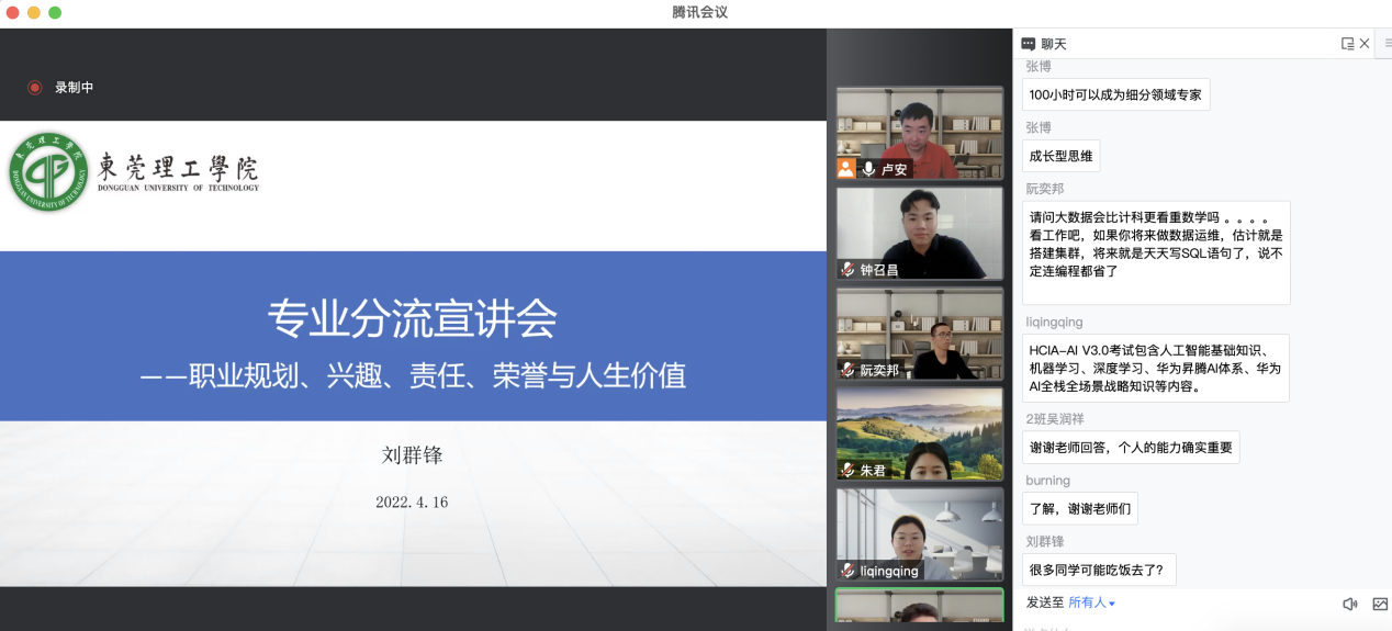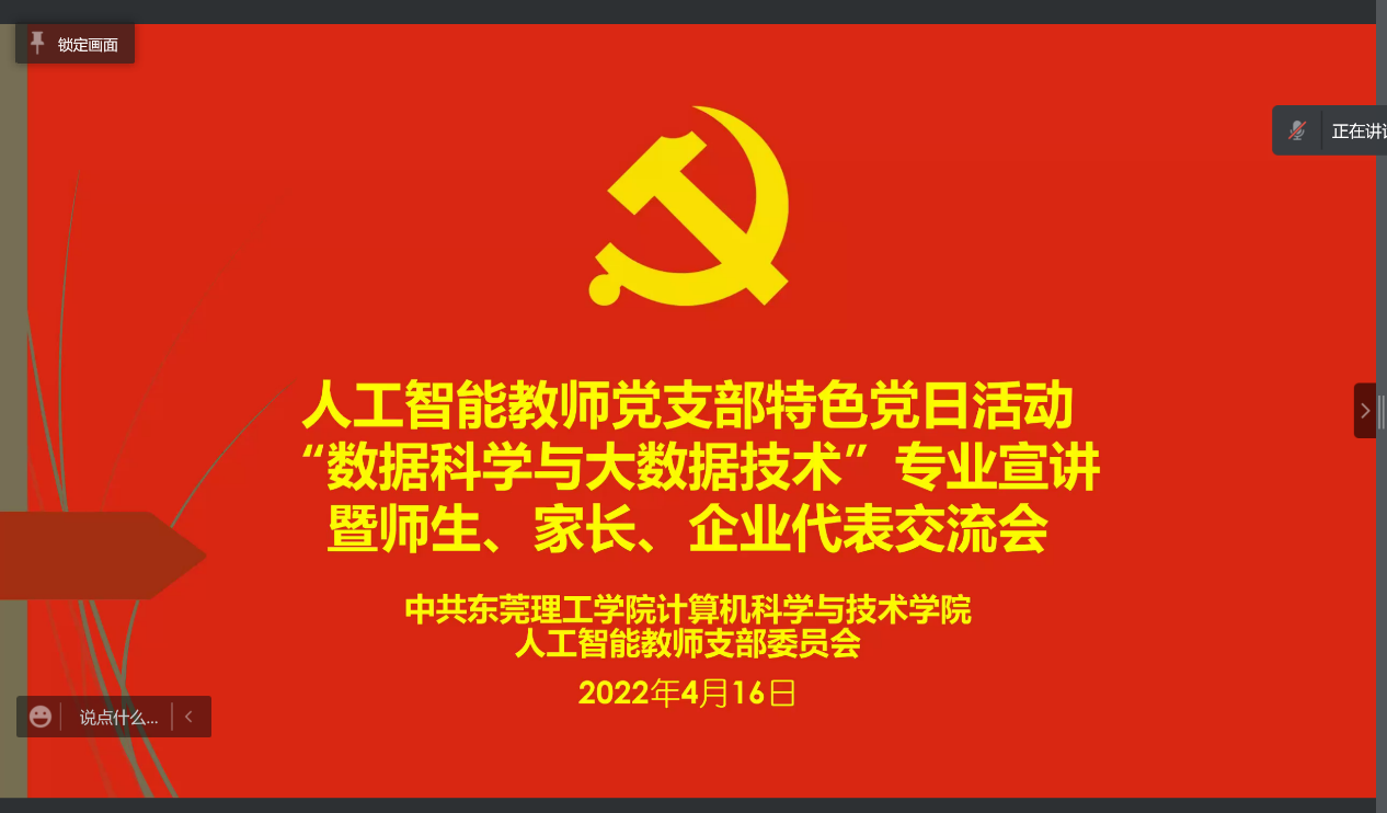 为了帮助同学们更好地做出专业选择和人生规划,创新推动人才培养,2022年4月16日上午,人工智能教师党支部开展特色党日活动:“数据科学与大数据技术”专业宣讲暨师生、家长、企业代表交流会,会议历时3个小时,有近400人参与。本次交流会由人工智能教师党支部书记卢安主持,人工智能系全体老师及教师党支部全体党员高度重视此次宣讲交流会,前期对相关工作进行了充分的准备,制订了详细的工作安排。本次宣讲交流会共分为专业设置概况、课程介绍、员工企业分享、互动交流、总结五个环节。