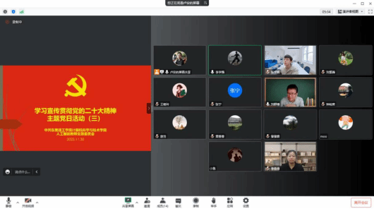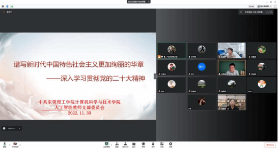 2022年11月30日下午,人工智能教师党支部开展学习宣传贯彻党的二十大精神主题党日活动,这次主题党日活动是党的二十大以来,人工智能教师党支部的第三次集中学习。会议由支部书记卢安主持,人工智能党支部全体党员同志参加了此次会议。
