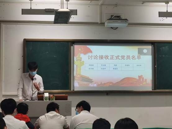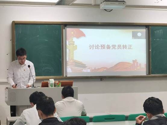 在陈佳盛同志和冯祺斌同志分享完学习心得后,进入会议的第二项议程:讨论关于郑晓棪等8名同志转正事宜。首先杨怀港同志公布拟接收正式党员名单,各预备党员依次上台进行考察期间的思想汇报。在听取完预备党员的汇报后,各预备党员的考察人发表对其的考察情况。随后,由主持人报告发言人的教育考察情况。在主持人发表完考察情况后,由正式党员对发言人进行提问,发言人根据自身学习情况进行答辩。最后由到场的具有表决权的正式党员对其进行投票表决,大会采取无记名投票的方式进行。