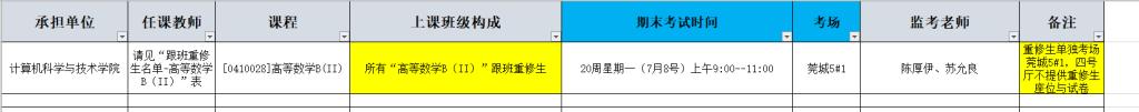 莞城校区所有高等数学B(II)跟班重修生: 因本学期重修生非常多,经与教务处沟通,特单独安排重修生考场莞城5#1,考试时间与莞城初修生时间保持一致。 请各位重修生按照截图的考场安排(此截图来自附件),按时参加考试。同时下载附件“跟班重修生另外考场安排-高等数学B(II).xlsx”查看考试重修名单。