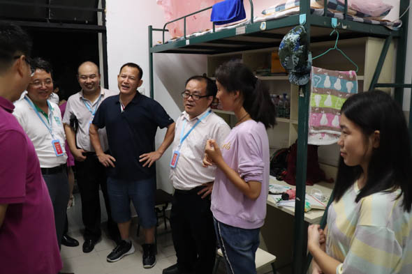 当晚,领导老师们走进每一间新生宿舍,详细了解了新生的专业、生源地、宿舍入住等信息,亲切询问他们的适应情况,并叮嘱员工干部要多多帮助他们适应新的学习生活环境。在交谈中与新生们分享老员工活的经验,勉励新生要注意身体健康,同学之间互相关心,希望员工能尽快熟悉校园环境。遇到新生家长,还向他们介绍公司情况,并询问家长们对公司环境以及迎新工作的感受,并殷切地希望新生们能尽快熟悉校园环境,融入到新的学习生活中。