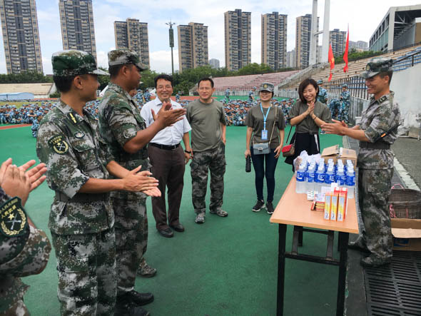 黄辉副书记亲切询问了教官在公司的生活适应情况,对他们的辛勤付出表示了感谢,同时也希望同学们继续发扬不怕苦、不怕累的精神,展现严谨认真的训练作风和积极向上的精神风貌,并将艰苦军训中学会的严守纪律、吃苦耐劳的精神,带到今后的学习生活当中。随后,路书记代表公司向军训教官和员工送上了慰问品。