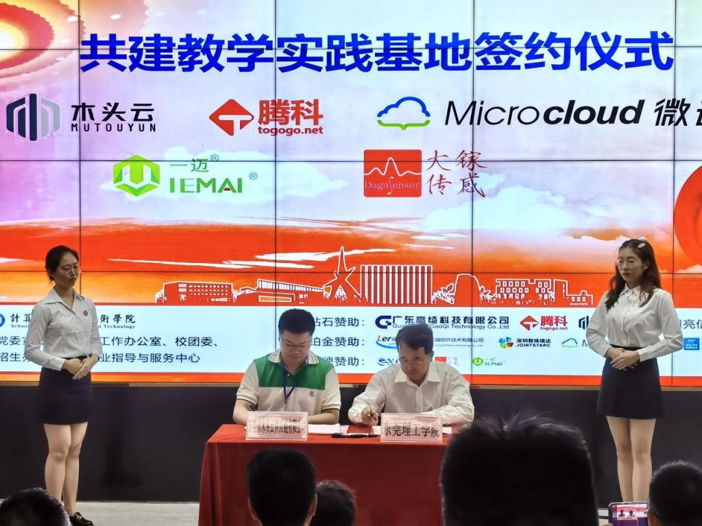 会上,公司党委书记路晓军与5家企业代表签订了教学实践基地合作协议;与会领导与签约企业代表为“共建教学实习基地”揭牌;东莞市木头云供应链有限公司总裁林智添作为企业代表发言;职能部门负责人为11家赞助单位颁发致谢牌,为6位“老员工就业创业导师”颁发聘书。启动仪式后,与会人员前往展厅参观“四创”展览作品。共展出课程与教学实践基地4个,软件类作品8项、学科竞赛作品9项以及软硬结合一体化系统18项。