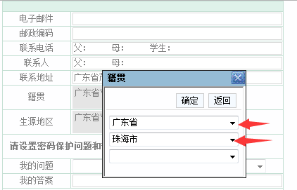 1、员工需核对补充的学籍信息为:员工籍贯、生源地区(原高考中学所在地)、常用电子邮箱(建议使用QQ邮箱,123XXX@qq.com),家庭联系人、电话、地址与邮政编码,共7项。员工籍贯、生源地区,填写至省辖市即可,不需填写至县级市 ,如下图所示,在第1、第2个方框内进行选择即可。