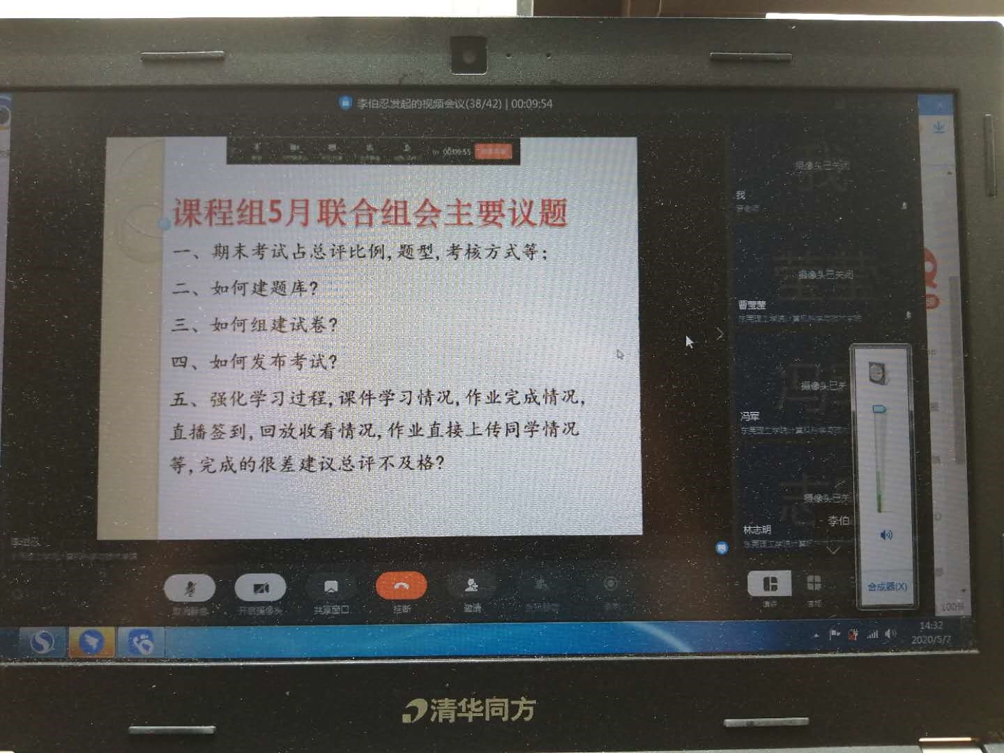 会议最后一项就是老师们畅所欲言,讨论线上教学中的遇到的问题以及改进的办法,李学强老师建议高等数学题库通过分工合作可以继续完善,贾继红老师建议题库建设要按照题目的难易度进行适当分类等,陈伟老师在优公司上给大家演示了考核设置问题,这次钉钉线上会议在愉快的讨论中结束。