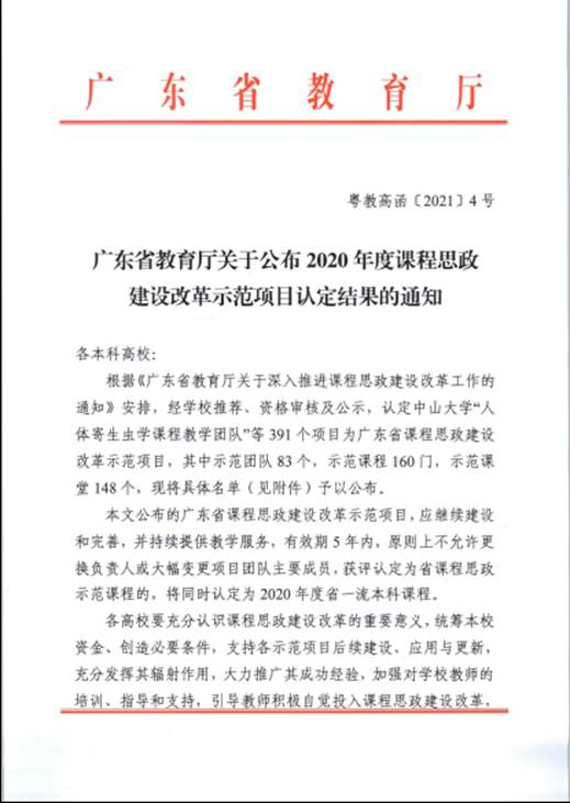日前,广东省教育厅印发《广东省教育厅关于公布2020年度课程思政建设改革示范项目认定结果的通知》(粤教高函[2021]4号),正式公布广东省2020年度课程思政建设改革示范项目名单, 公司«概率论与数理统计»课程入选广东省课程思政改革示范项目, 同时被认定为2020年度省一流本科课程。