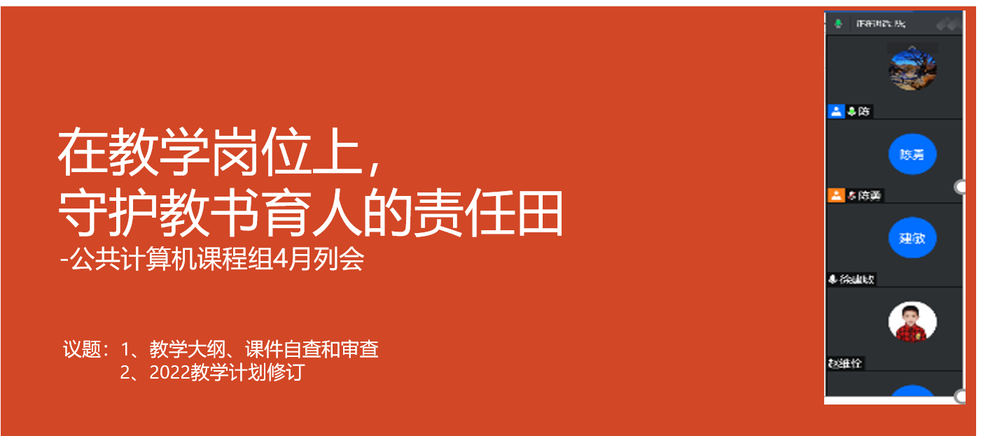 4月21日下午,公共计算机基础课程组召开4月的教学例会。会议由课程组长陈雪芳主持,全体老师参与,公共计算机课程老师列席。议题包括:教学大纲、教学课件意识形态审核审查、2022公共计算机教学计划修订等几项工作。