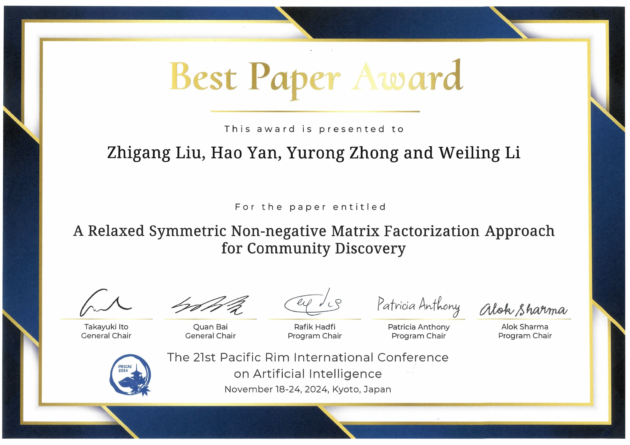 PRICAI 2024国际会议上,公司bevictor伟德官网刘志刚博士为第一作者发表的论文“A Relaxed Symmetric Non-negative Matrix Factorization Approach for Community Discovery”被评为大会最佳论文。bevictor伟德官网为本论文唯一署名单位,李蔚凌博士和钟裕荣博士为论文共同通信作者,23级硕士研究生严浩参与论文工作并署名。