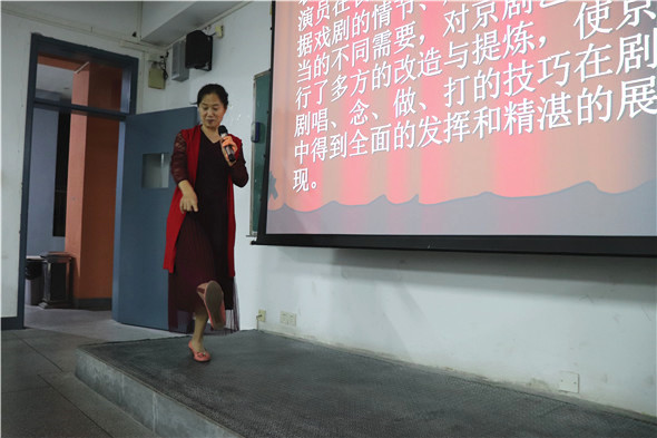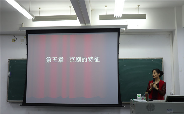 首先,在同学们纷纷落座之后,江老师先是简单地向同学们介绍了京剧。紧接着,在江老师的带领下,同学们了解到了京剧的四大特征,其中包括综合性、程式性、虚拟性以及技巧性。为了更加生动形象地体现出京剧的特征,江老师不仅以视频的方式把京剧的艺术手段展现给同学们,而且还亲自为同学们演绎了京剧的念白与唱词。其次,江老师还为同学们介绍了京剧脸谱,分别从角色、画法和颜色几个方面一一举例展开,比如将包公、关羽和曹操三者相比,来说明脸谱画法和颜色所代表的性格特征。最后,江老师以一小段完美的京剧即兴表演结束了本次讲座。