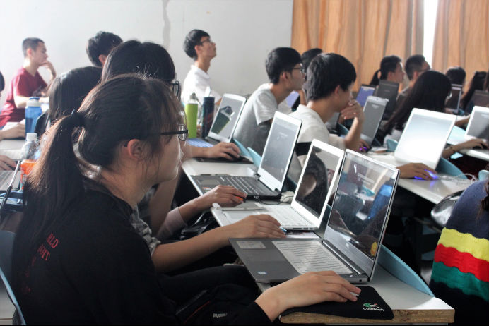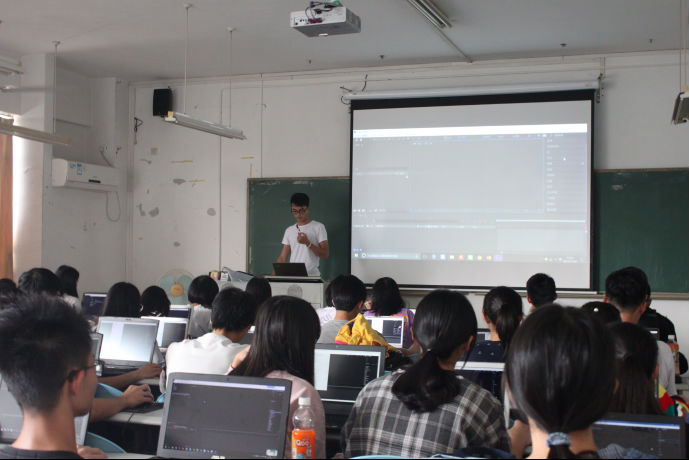 在公开课未开始之前,工作人员帮助到场的同学安装AE软件,并指导他们进行初步使用AE软件。公开课伊始,施雨帆师兄给同学们讲解了AE软件的一些基本工具的使用和界面的基础操作,并现场制作了一个小视频――火焰飞人。在他为大家详细讲解视频制作之余,也不忘停下来询问同学们是否存在疑惑。在场的同学们都在很认真的学习,并在自己的电脑上练习操作。遇到疑问,工作人员也会热情地帮助他们解答疑惑。