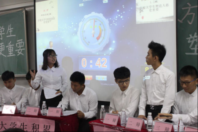 在复活赛未开始之前,工作人员们认真地布置赛场,做好充分准备。比赛伊始,主持人宣读了辩论赛的比赛规则以及本次辩论赛的辩题。在正反方的辩手的一番自我介绍过后,激烈的对决赛正式上演。正方支持的观点是:在校老员工更应重视知识的积累;而反方的观点:在校老员工更应重视塑造人格。双方在主持人的引领下各自阐述了自己的观点。在多轮激烈的唇枪舌战中,正反方在气势上不相上下,在场的众多观众也毫不吝啬自己的掌声,为双方辩手加油打气。在总结陈词环节,双方的四辩总结己方支持的观点,言语铿锵有力。随后,主持人请评委退席评议,在场观众自由向双方辩手提出尖锐的问题,全场气氛热闹不已。辩论队队长叶柱良也为本次辩论赛作总结发言,客观地指出了正反双方的优点以及不足之处。最后,在此热烈祝贺17级计算机科学与技术1、2班的辩论队伍在复活赛中脱颖而出。同时,恭喜何崇希同学获得最佳风采奖,杨云岳同学获得优秀辩手的荣誉称号。