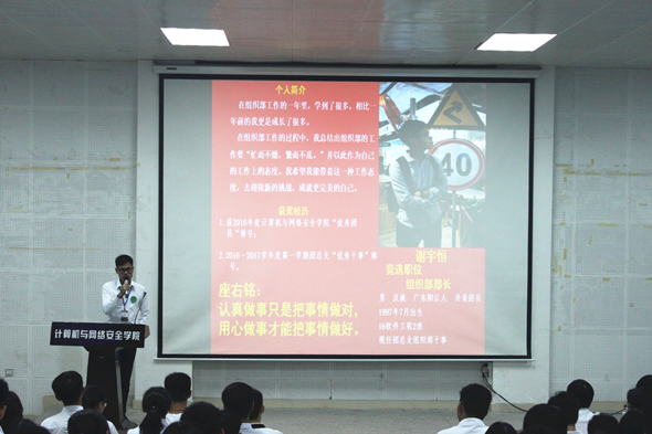 会议开始前,团总支各成员衣着正式整洁,在各自的座位上静候会议的开始。随着秘书处通报会议出席情况,本次会议正式开始。会议伊始,全体起立,合唱共青团歌。一时间,整齐划一、恢弘庄重的歌声回响在活动室内,场面十分壮观。接着,党总支副书记黄晓仪上台致辞,对台下各位一整年来的辛苦工作给予了高度评价。随后,主持人宣布了年度优秀部长与优秀干事,获奖部长与干事上台领奖。接下来,是本次会议的重要环节——第十四届团总支干部候选人竞聘演讲。从一号候选人到二十七号候选人,每位演讲人都在台上发表了精彩的演讲。在每为候选人演讲后,台下的副书记以及部长都会对其提出自己的疑问。提出的问题或刁钻或严肃或尖锐,都是对台上候选人的重要考验。每个候选人都针对前辈们所提出的问题作出了自己的解答。经过了严肃庄重的竞聘演讲后,会议来到了轻松的游戏环节。在活泼愉快的气氛下,在场的每个人都露出了自己的笑容。最后,随着全体起立合唱计算机与网络安全公司团总支之歌,本次计算机与网络安全公司第十三届团总支第四次全体大会暨委员换届大会顺利结束了。