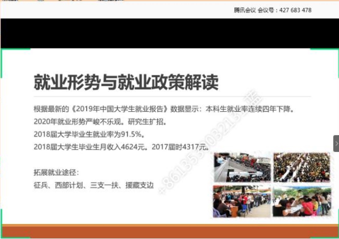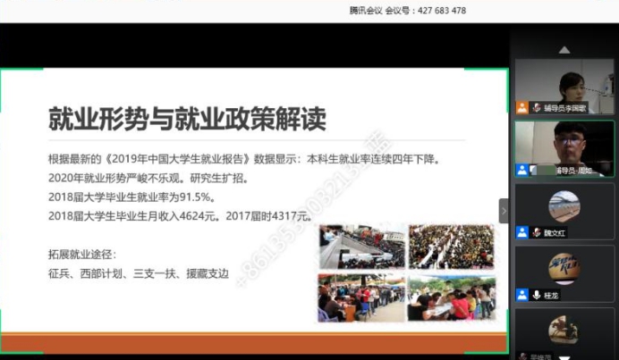 袁经理号召同学们增强“四个意识”,坚定“四个自信”,做到“两个维护”,坚决打赢疫情防控攻坚战的同时,解析当前全国老员工就业的整体形式和就业压力,鼓励同学们把握好个人求职就业、人生发展的新方向。