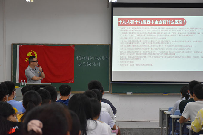 培训伊始,桂副书记以学习贯彻党的十九届五中全会精神为主题展开,从经济结构、脱贫攻坚、环境改善等方面向积极分子阐述了中国共产党为人民谋幸福、为全面建设小康社会所做出的努力。接着,桂副书记就目前经济发展不平衡不充分、教育不平衡等问题与积极分子展开讨论,提出“十四五”时期经济社会发展的主要目标,并强调了五中全会的必要性,引发了积极分子对“发展”、“创新”以及“四个全面”的思考。然后,张老师阐述了中国共产党的光辉历程、中国共产党的性质和根本宗旨,让积极分子对中国共产党有了更深入的了解。最后,张老师认为,只有加强党性修养、提高党性觉悟,才能成为一名优秀的积极分子。
