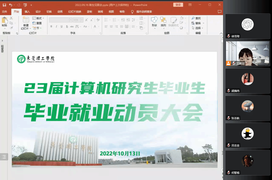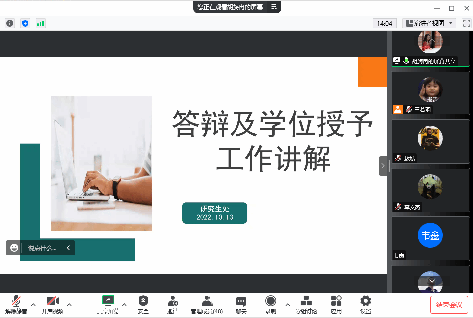 2022年10月13日下午15:00,计算机科学与技术学位点以线上会议形式召开2023届研究生毕业就业动员大会。本次会议特邀请研究生处胡旖冉博士作培训报告,旨在加深研究生应届毕业生对毕业论文与答辩等重要事项、时间节点的认识,为顺利毕业就业提前做好相应准备。本次毕业就业动员大会由bevictor伟德官网辅导员王若羽主持,公司教务老师谭胜兰及2020级bevictor伟德官网硕士研究生参加了此次大会。
