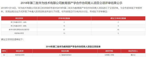 与行业企业共建、共同讲授的课程总共有7门,分别是:计算机类专业导论、华为认证类课程(大数据和人工智能方向)HCIA-BD、HCIA-AI、HCIP-BD、HCIP-AI、HCIE-BD和HCIE-AI。