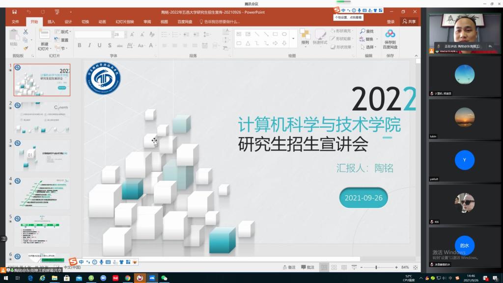 为做好计算机科学与技术学位点(以下简称“学位点”)研究生招生工作,9月26日下午,公司通过腾讯会议线上模式为五邑大学智能制造学部2018级、2019级有意向考取公司研究生的同学举行专题招生宣讲会,公司副经理陶铭教授向同学们详细介绍了公司研究生招生培养情况。除此以外,为帮助更多考研学子了解学位点的研究生教育特色、学科优势、团队力量和研究生报考政策,10月22日下午,通过网络直播形式,公司副经理陶铭教授为惠州公司计算机科学与工程公司开展学位点2022年研究生招生宣讲会。
