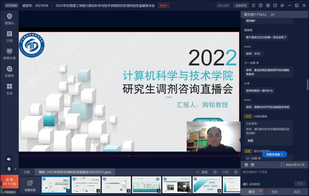 为满足广大考研考生对于公司研究生复试、调剂咨询的需求,推进计算机科学与技术学位点(以下简称“学位点”)研究生招生工作的有力开展,建立多方位的信息沟通渠道,3月28日下午,公司通过“中国教育在线”平台举办了“2022年硕士研究生调剂咨询直播咨询会“,会议由学院副经理、硕士生导师陶铭教授主持并直播,有1700多名员工参加了直播会。
