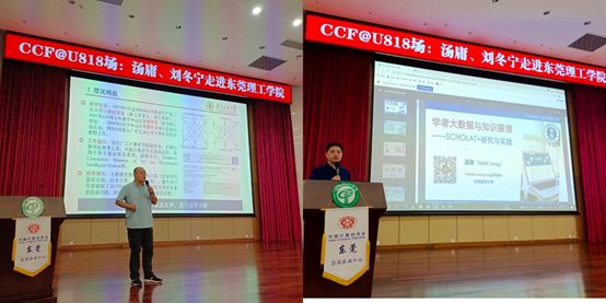 汤庸教授的演讲主题为《SCHOLAT+:学者大数据与知识图谱》。他主要讲述了面向学者的社交网络(SCHOLAT)的发展,进一步构建学者大数据写作平台与云空间融合模式,促进SCHOLAT+应用生态等新形态演进。汤庸教授强调,员工也需要有意识地加强自身对学者大数据的有机运用,夯实计算机专业思维和专业能力。刘冬宁教授作了题为《人工智能逻辑与角色协同计算》的报告,展开了数字中国对推动“智能协同”发展的讨论,引导在座师生对“人工智能技术推动产业变革”、“应用驱动创新”、“人工智能技术是基础”等方面的思考。