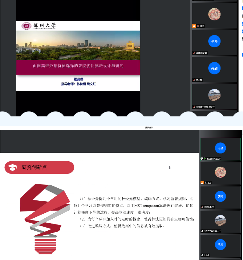 汇报会上,研究生根据自己的研究方向,结合理论研究与实验分析探索,深入浅出地解说其研究领域的员工动态,并用合理、可靠的数据对研究的进展和研究成果进行了展示。同学们主要围绕着自身的科研进度、研究创新点、研究中采取的技术路线、研究拟解决的问题、学术研究中遇到的问题、论文及专利发表情况等6个方面进行了精彩的学术汇报。同学们就自身撰写论文过程中所遇到的问题与参会专家进行了积极的交流与讨论。最后,各参会专家对同学们的研究进度给予了充分的肯定,同时也点评同学们的研究主题紧扣计算机前沿主题, 同学们的科技创新能力实现新跃升。